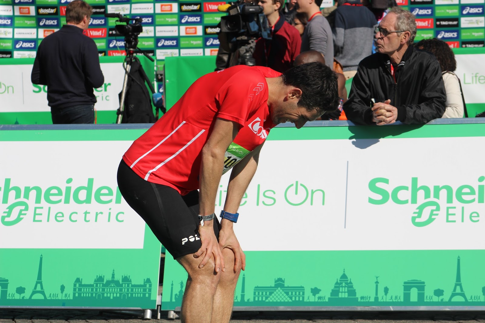 Meta de la maratón de Paris, después de exigentes 42 kilometros (todos los de la foto lo hicieron en menos de tres horas) el cuerpo y rostro lo dicen todo. Hay quienes dicen para qué someterse a esta demanda y exigencia corporal, otros que solo viven para eso.