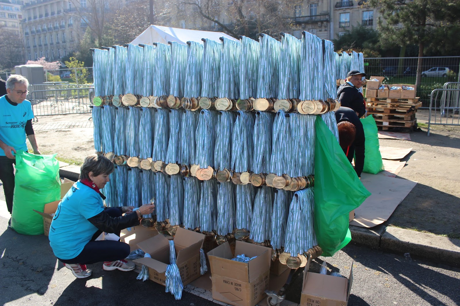 | Las medallas abandonan su carton, esperan a quienes terminen la maratón de Paris |
