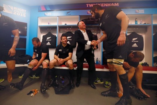 | El jugador de los All Blacks, Sam Whitelock, saluda al Primer Ministro de Nueva Zelanda. La diferencia de tamaños motivó todo tipo de comentarios. |