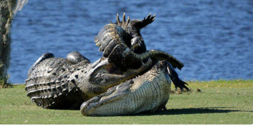 | Un día mas en n campo de golf en Florida, dos lagartos pelean entre si, ante loa vista y cámara de fotos de los presentes. |