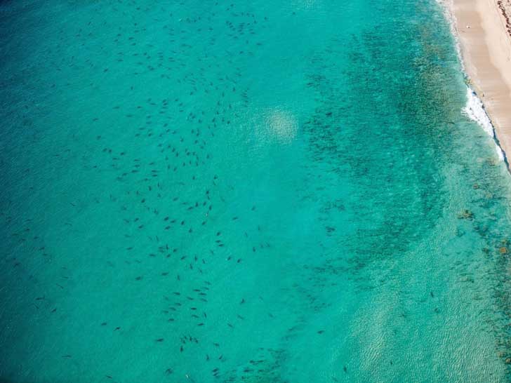 Durante su recorrido se pueden ver miles muy cerca de las costas de algunas playas en el sur de Florida, esta foto es en Palm Beach, cerca de Cabo Cañaveral, cada punto negro es un tiburón de dos metros, los investigadores estiman que cerca de 10.000 tiburones han pasado por estas playas.
