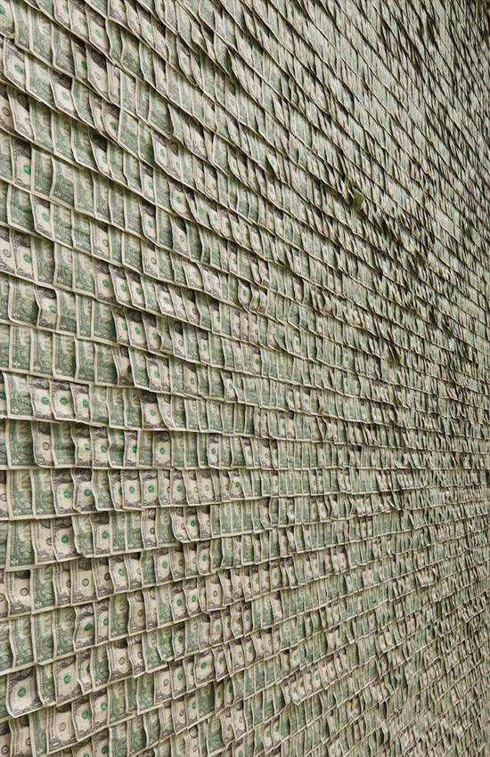 Son 100.000 billetes de $1, pegados en las paredes y que buscan representar lo que el artista de 70 años dice es la vision del arte de hoy.