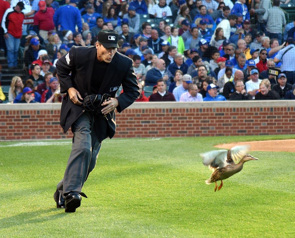 El umpire de beisbol Angel Hernandez deja claro que todos tienen que salir de la cancha para iniciar juego