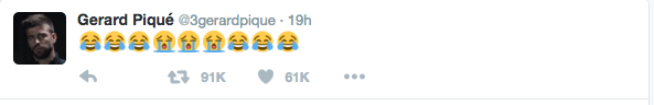 Solo esto basto para que Pique exprese su sensación y goce por lo ocurrido con el Real Madrid y su error al alinear a Denis Cheryshev en la copa del rey cuando este estaba suspendido.