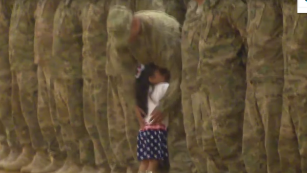 La pequeña Cara rompe el protocolo y corre a abrazar a su padre, el teniente Oglesby |