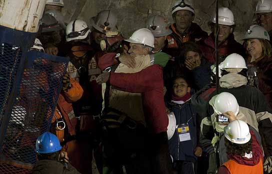 Primer minero en ser rescatado, Florencio Avalos y su abrazo descomunal con el presidente de Chile, Sebastian Piñera.