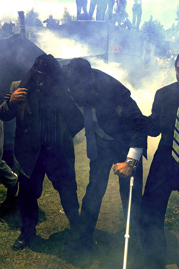 El presidente Rafael Correa abandona el regimiento de la policía de Quito protegido por su seguridad y mascara antigas. No hubo forma de dialogo o conciliación, tuvo que apresurarse a abandonar el lugar, en el intento, su rodilla recién ope